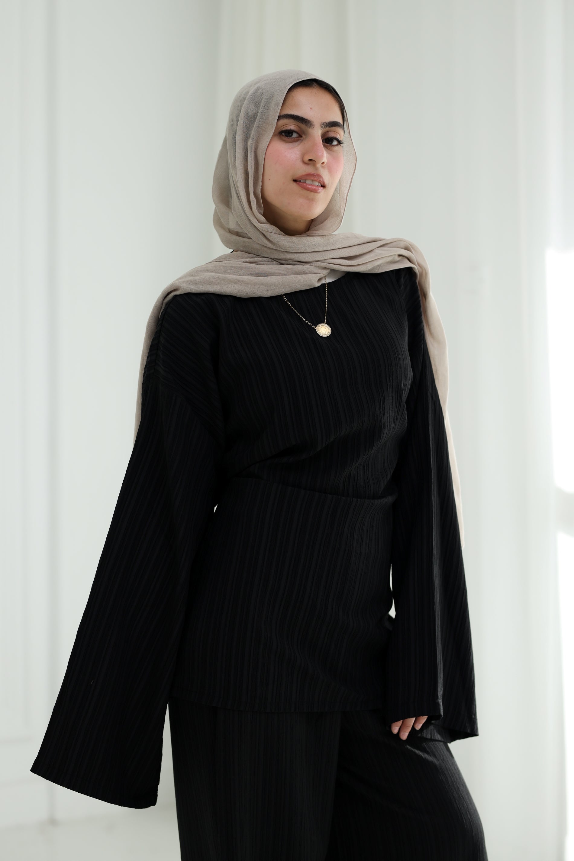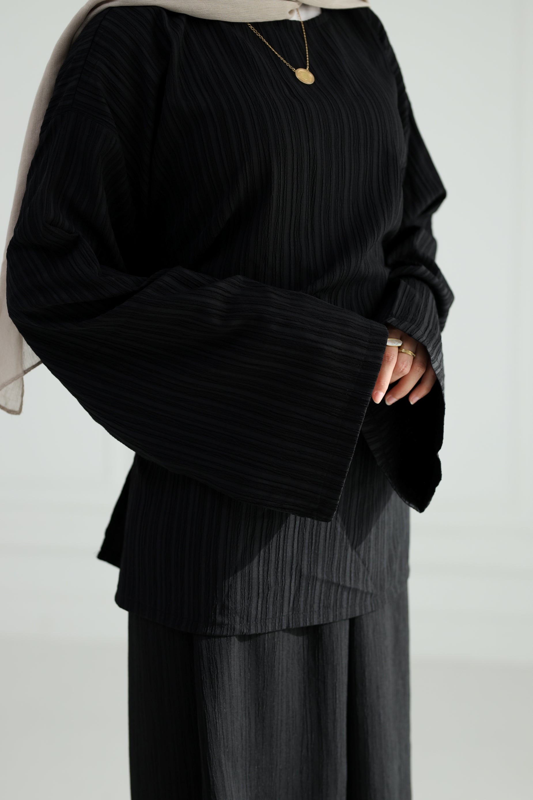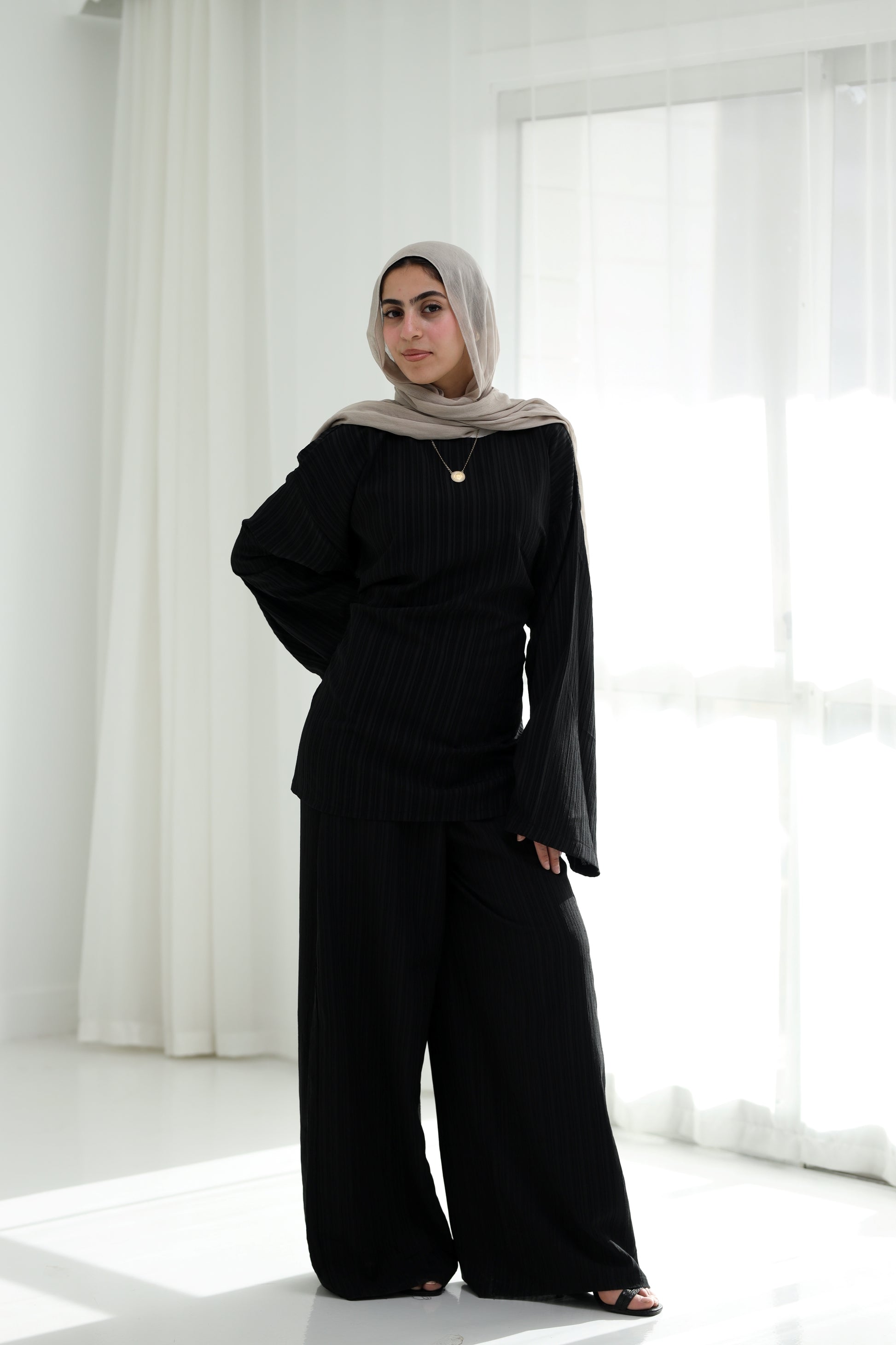 Sleek. Effortless. Elevated. This striped set in noir is your go-to for modern minimalism with a modest twist. Crafted from a textured, breathable fabric, this two-piece set includes a relaxed-fit tunic top and wide-leg trousers for maximum comfort and style. Subtle tailoring at the waist adds shape without sacrificing ease, while the flowy silhouette keeps you polished from day to night.