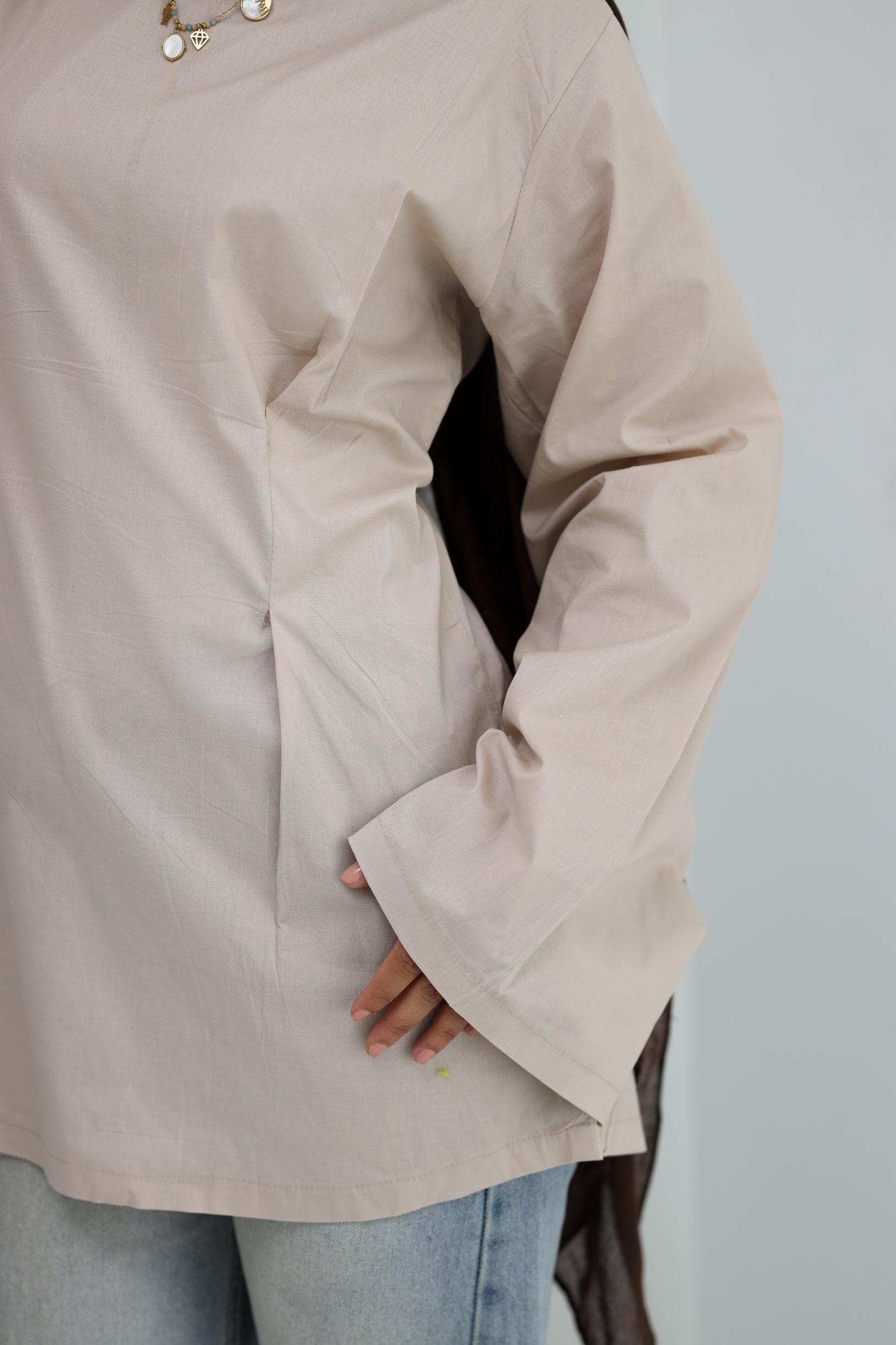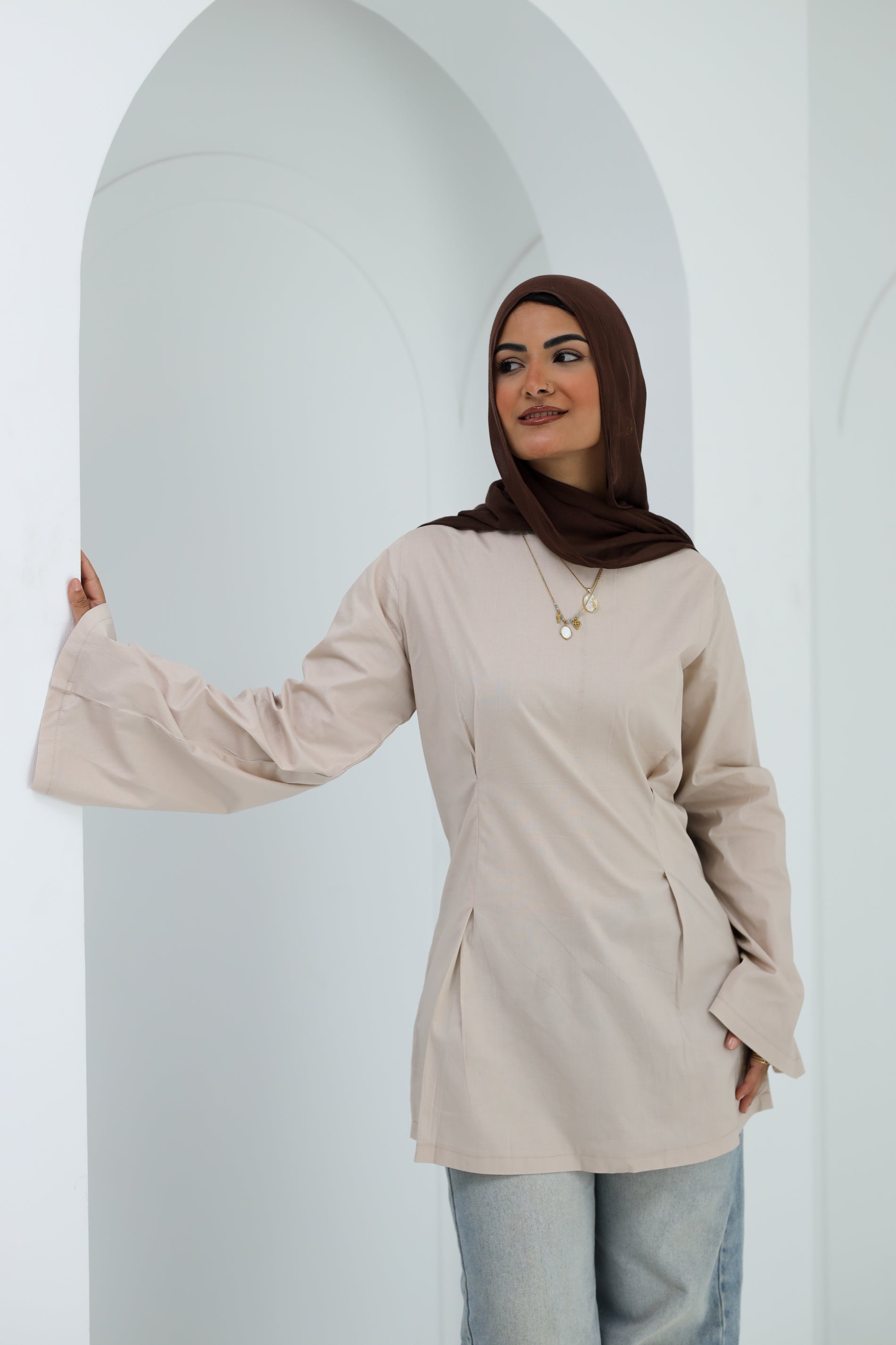 Pure, timeless, and effortlessly refined—the creme asmira blouse embodies understated luxury. Tailored from crisp, breathable cotton‑blend poplin in a whisper‑ivory shade, it brightens any outfit while remaining delightfully versatile. Subtle princess seams skim the waist for a flattering yet modest silhouette, and the wide, softly flared sleeves lend graceful fluidity to every move. Pair it with light denim for an airy daytime look or tuck it into tailored trousers for chic, minimalist sophistication.