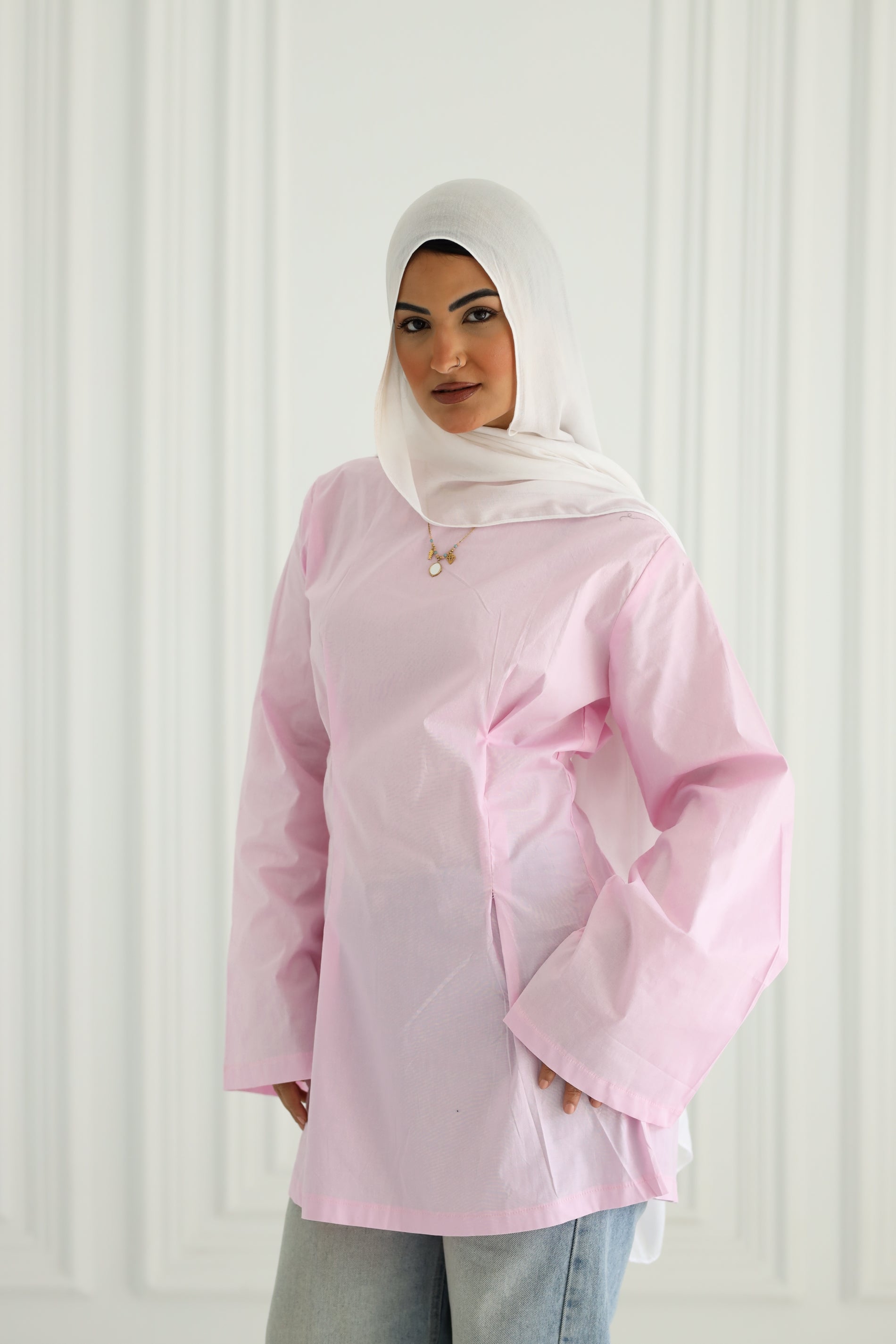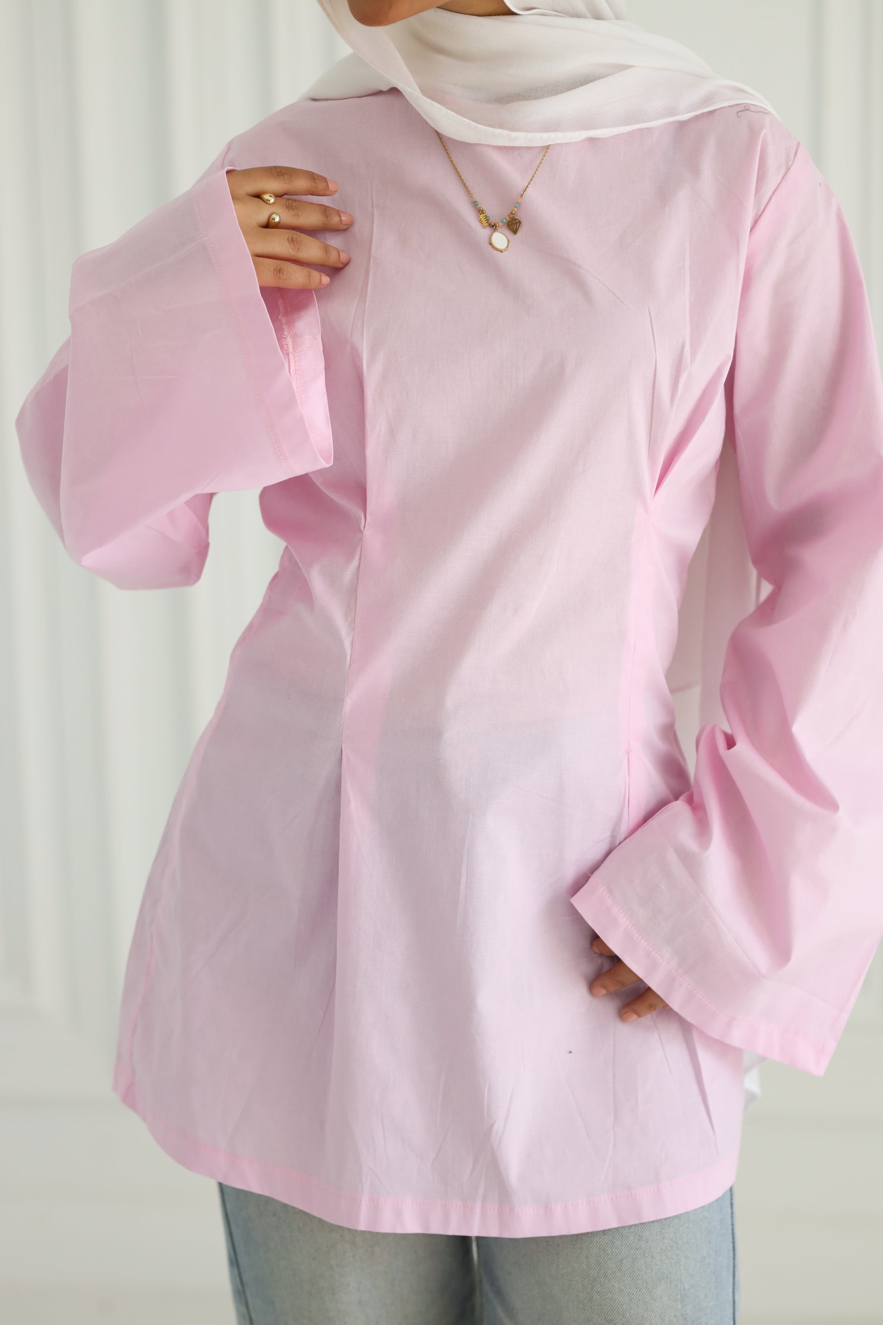 Light as spring air and sweet as sunrise, This blush Blouse is your new go‑to for effortless femininity. Cut from crisp, breathable cotton‑blend poplin in a delicate petal‑pink hue, it features clean princess seams that subtly shape the waist while keeping the fit easy and modest. Wide, flowy sleeves finish in gently flared cuffs, adding graceful movement with every gesture. Dress it down with faded denim for daytime charm or tuck it into tailored trousers for an instant dose of polished pastel perfection.