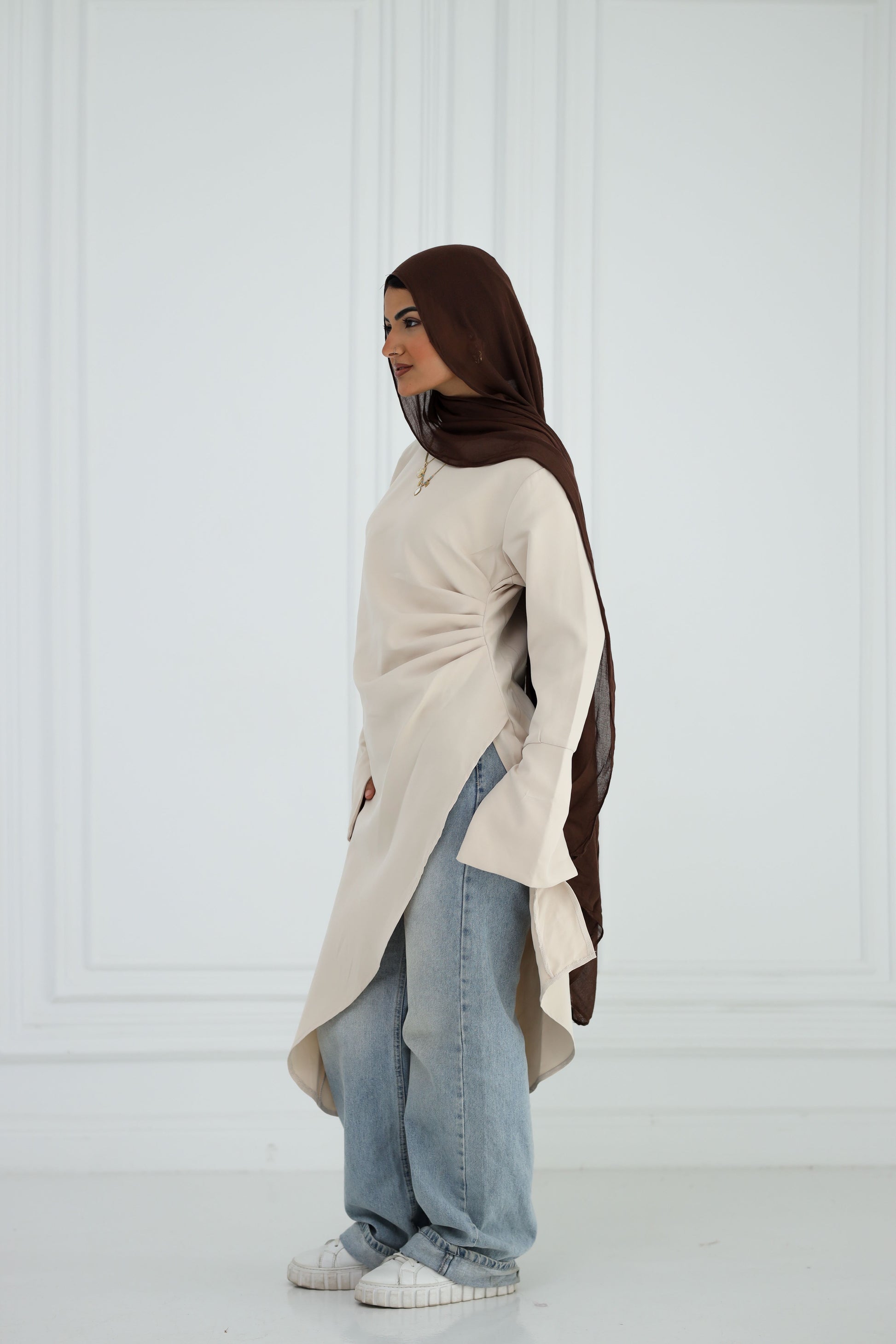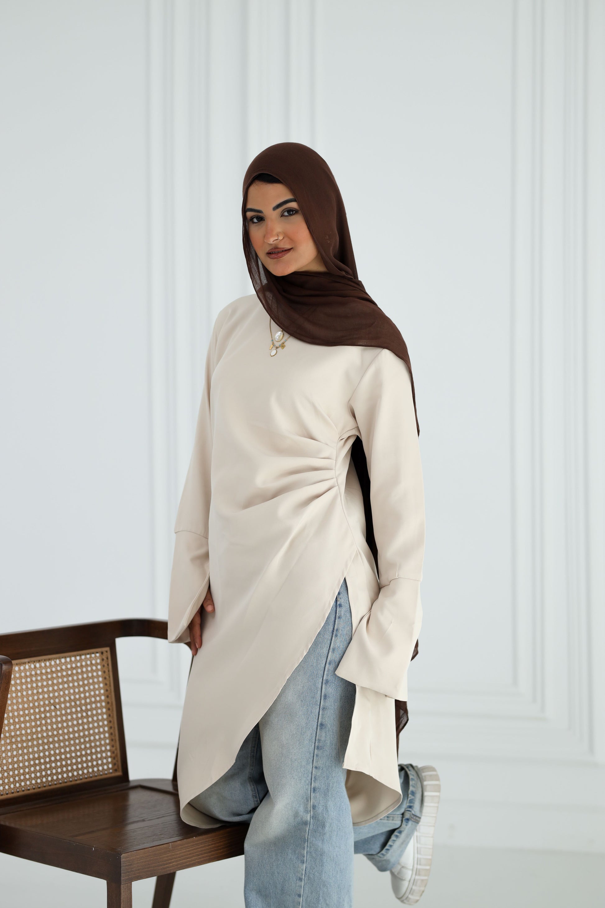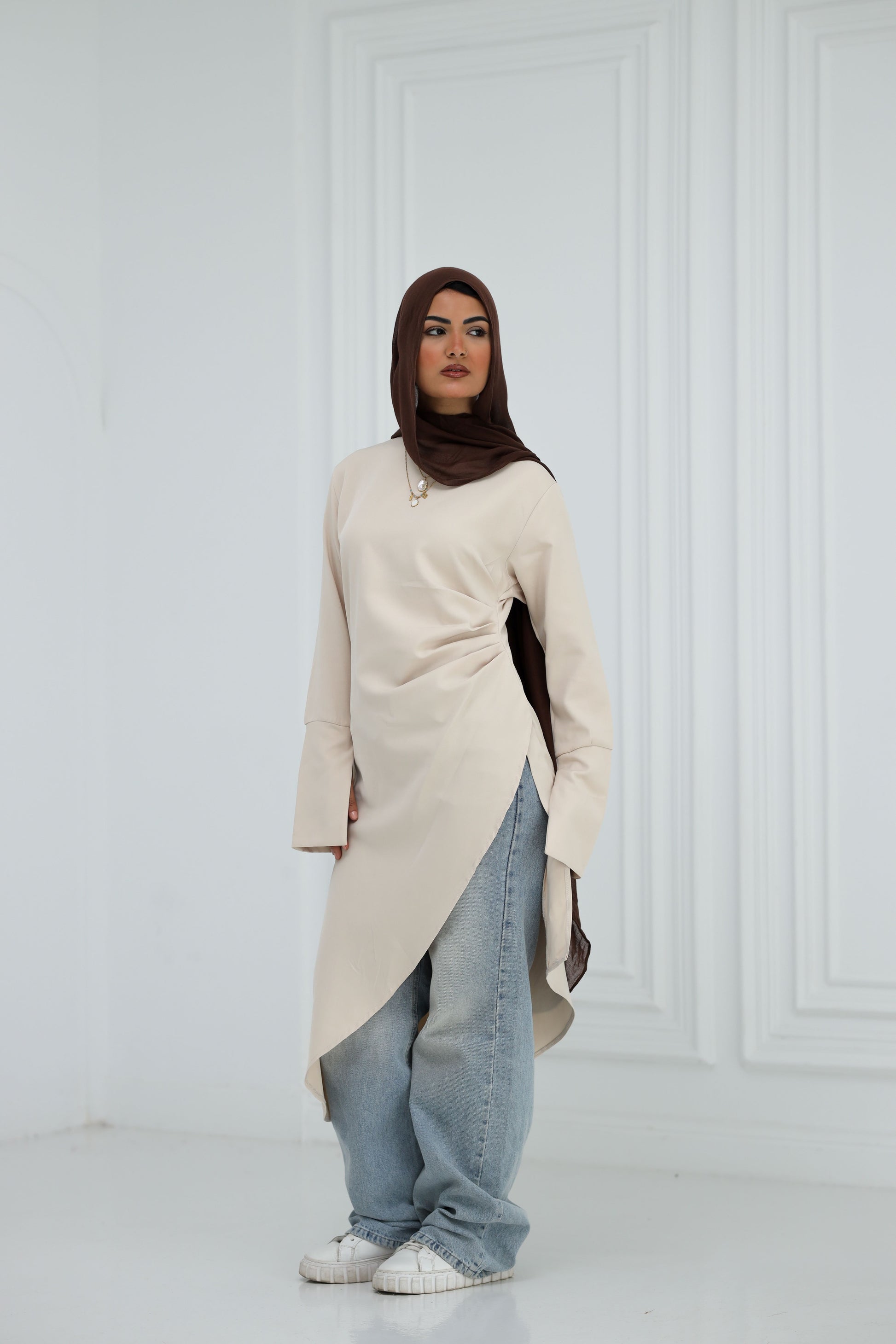 Elevate your essentials with the Ayla blouse-tunic in a warm crème tone that flatters every complexion. Cut from our signature fluid, wrinkle‑resistant crepe, it features the collection’s hallmark side‑gathered drape and sweeping asymmetric hem for graceful movement and modest coverage. A minimalist crew neckline and slim sleeves maintain a refined profile, while hidden side pockets keep it practical for everyday wear. Pair it with soft neutrals for a monochrome statement or contrast with rich earth tones for effortless sophistication.