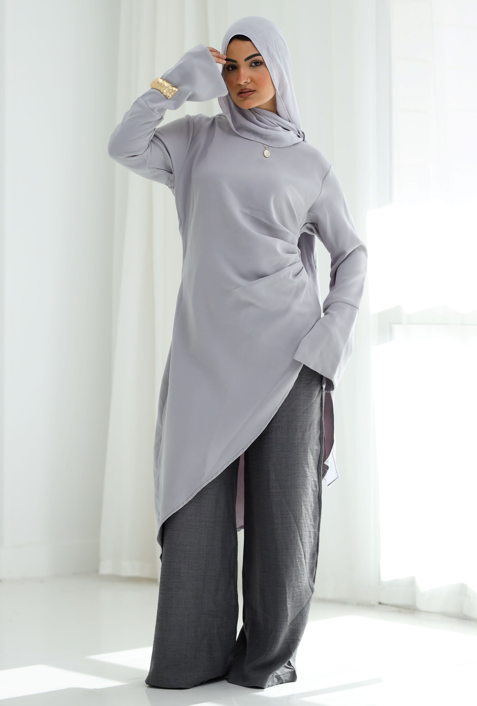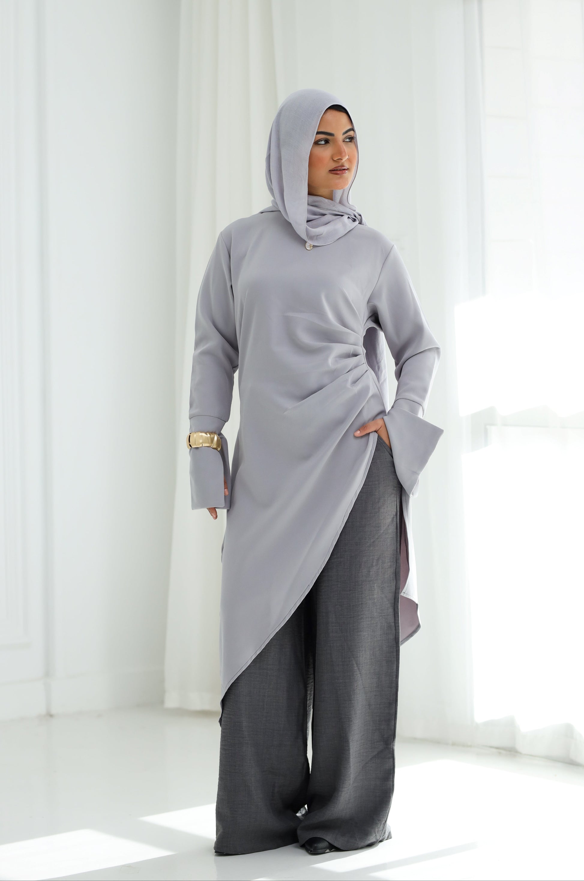 Soft, serene, and subtly striking. This blouse-tunic is crafted from fluid, wrinkle‑resistant crepe, it drapes effortlessly with a chic side‑gather that skims the waist and a sweeping high‑low hem that adds movement to every step. A clean crew neckline and streamlined sleeves keep the look polished, while discreet side pockets bring everyday ease. Style it over crisp white trousers for airy refinement or layer with charcoal pants for tonal sophistication.