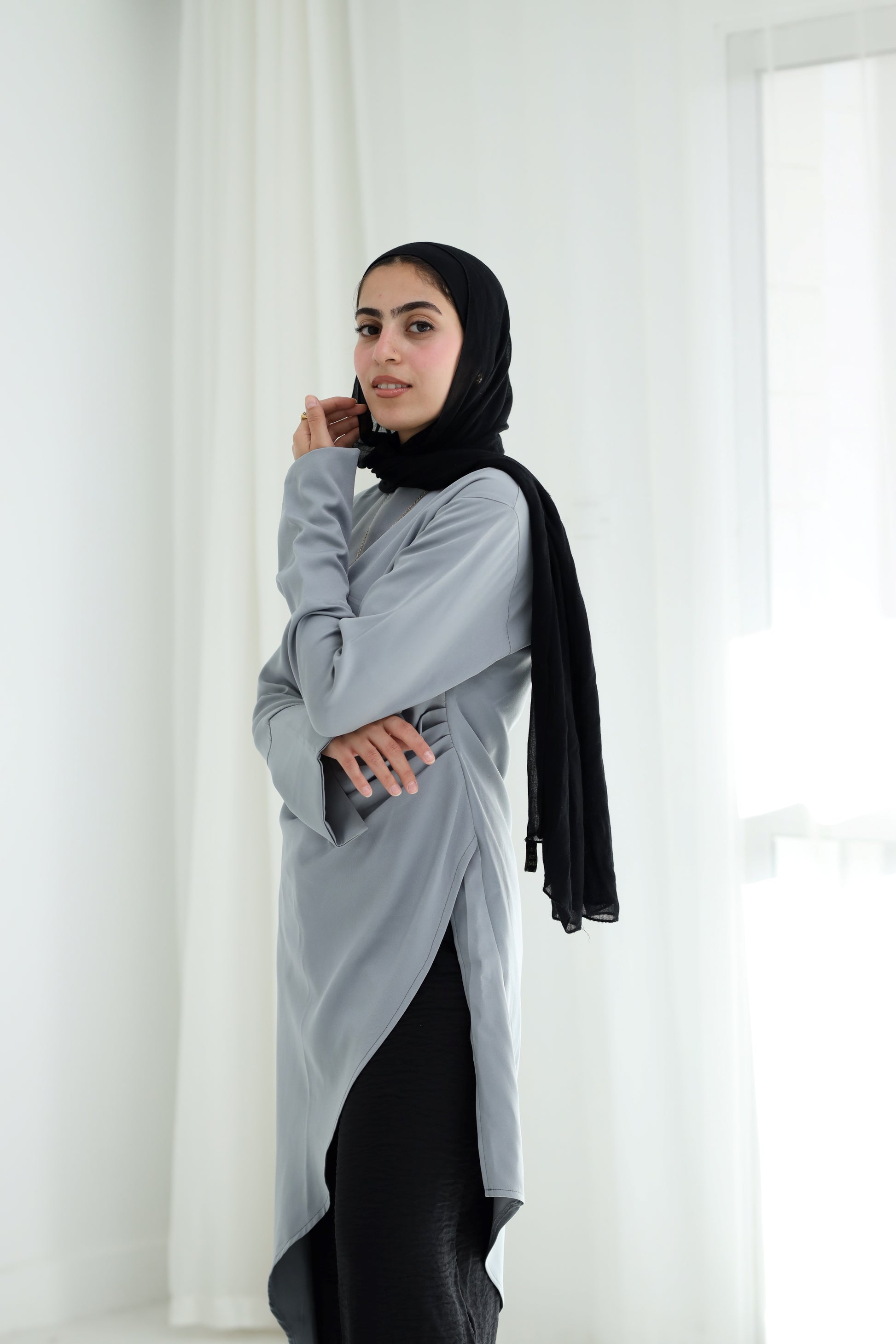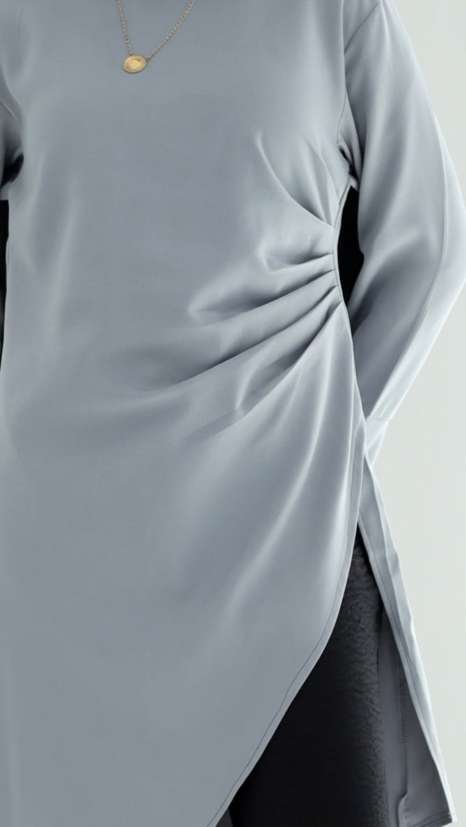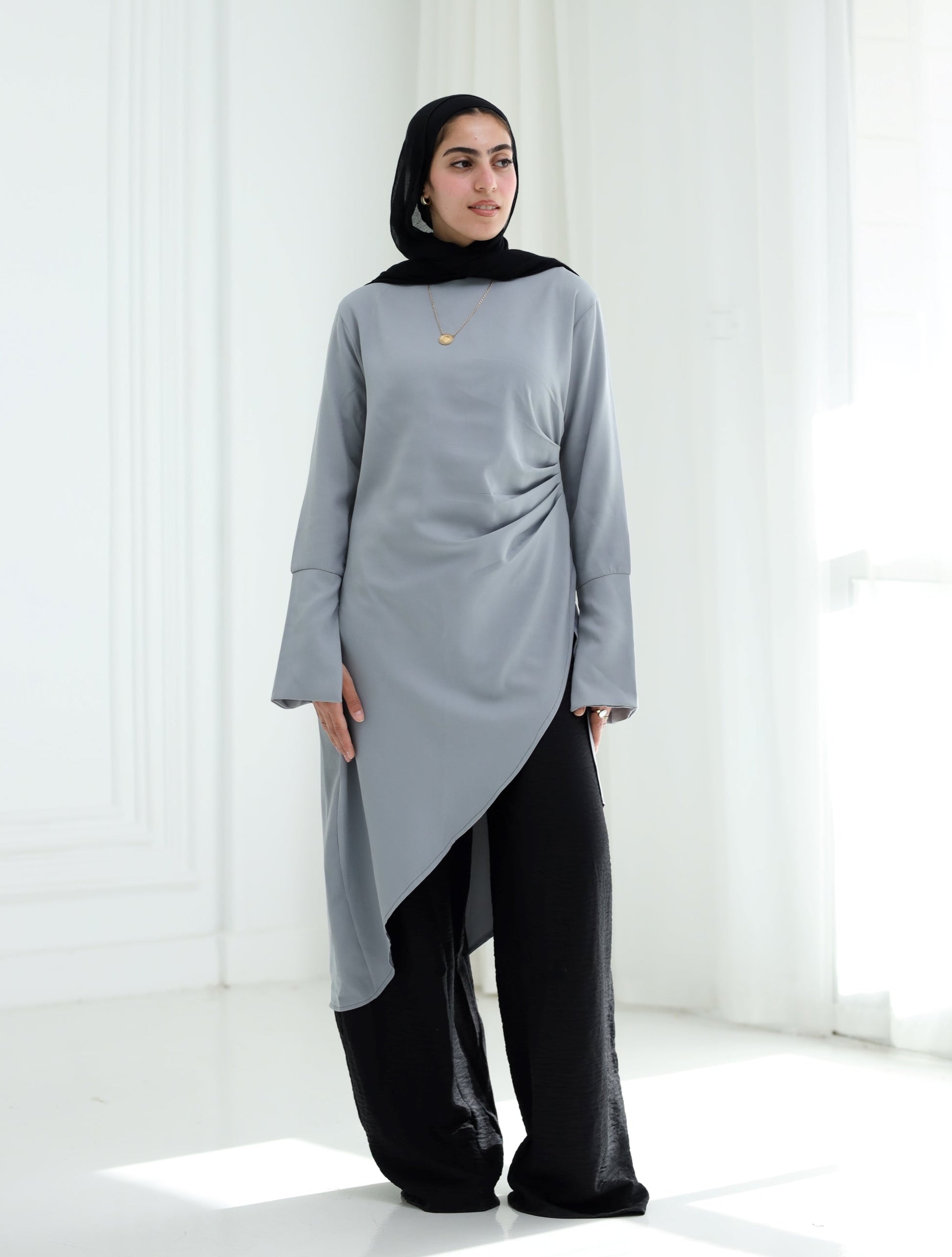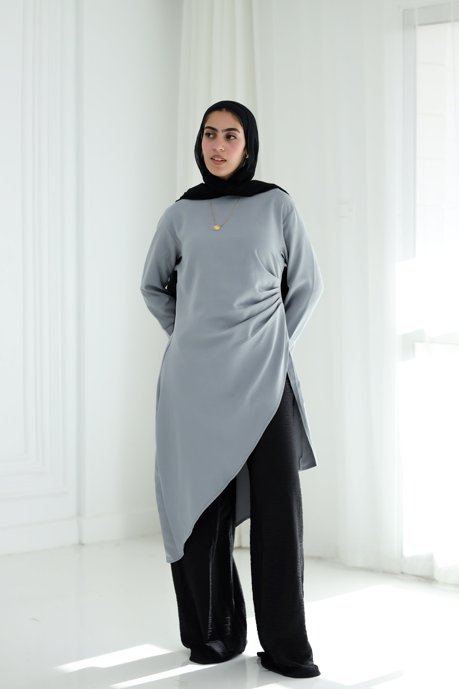 Bold lines meet effortless modesty in the Ayla blouse-tunic. Cut from fluid, wrinkle‑resistant crepe in a sophisticated dove‑grey, this longer‑line blouse makes a statement with its asymmetrical hem and artful side‑gathered drape. The clean crew neckline and slim sleeves. Layer it over wide‑leg trousers for architectural elegance, or pair it with slim jeans and heels for sleek, contemporary style.