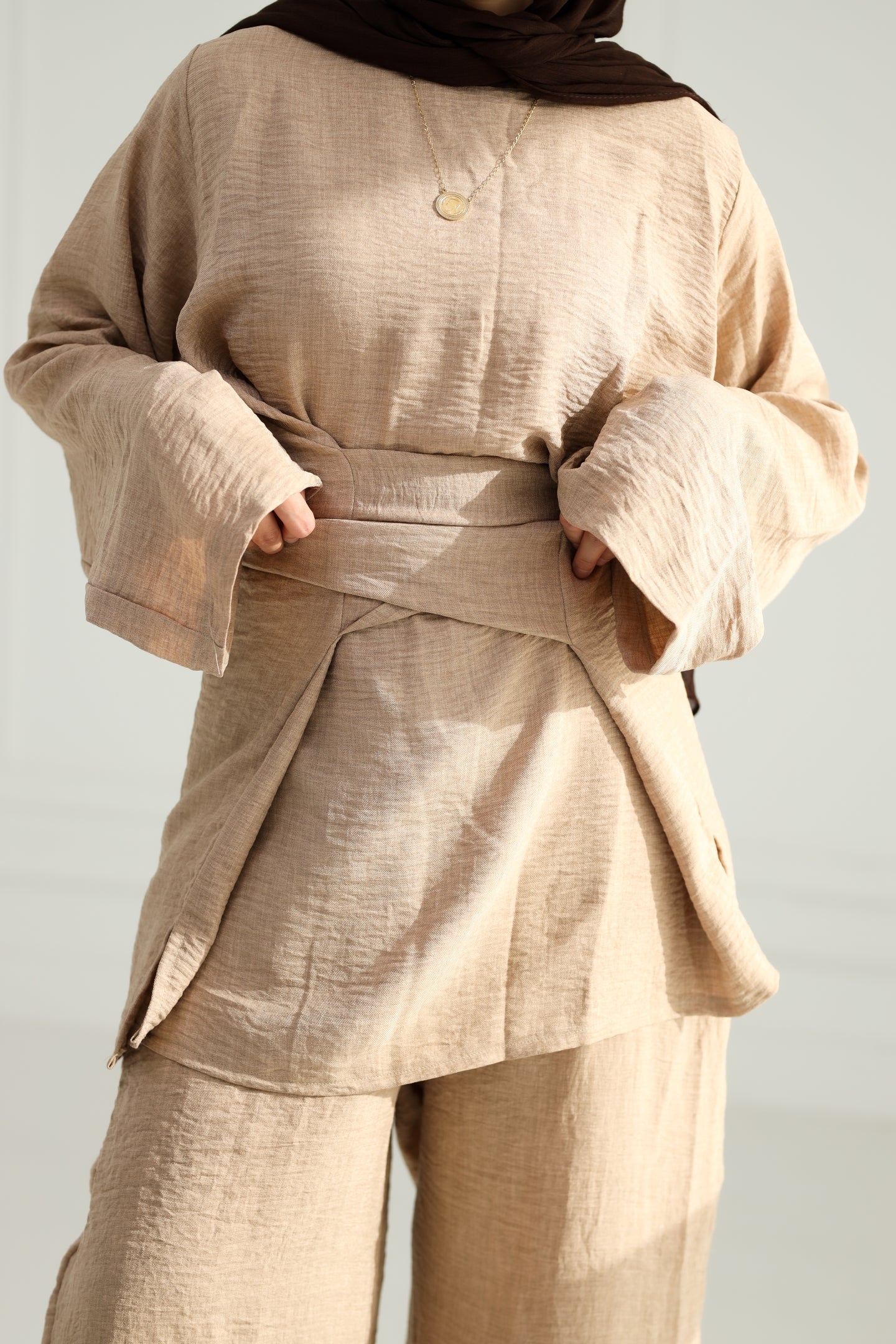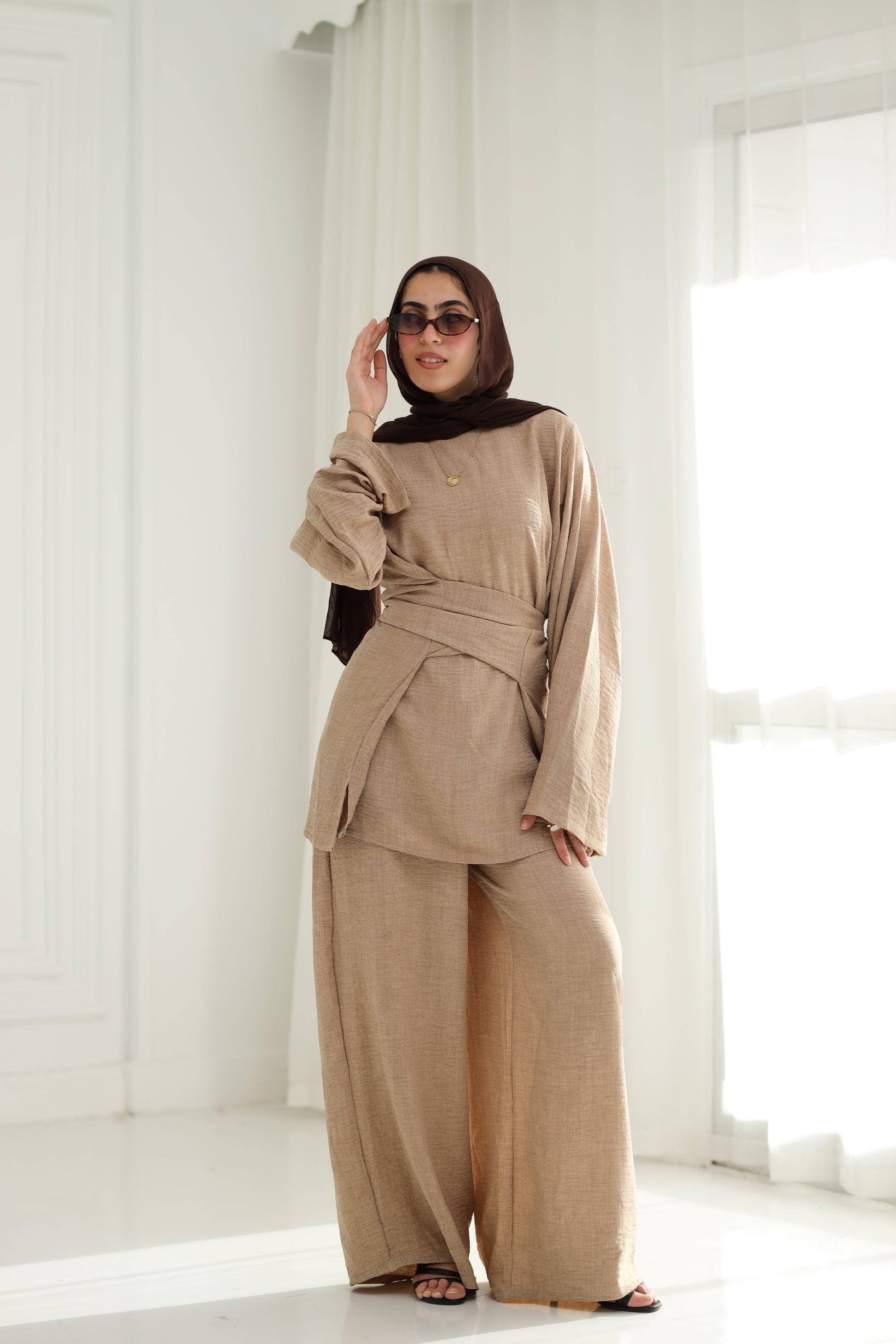 Redefine refined comfort with our Zahia set in a timeless sandstone beige. This effortlessly elegant ensemble features a relaxed-fit top with a statement wrap detail that flatters the waist while maintaining modest coverage. Paired with matching wide-leg trousers, the set is crafted from a breathable, lightweight fabric that flows beautifully with every step.